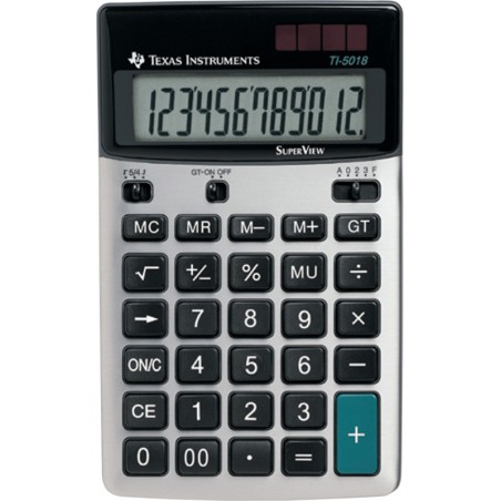 Calculatrice de base TEXAS INSTRUMENTS TI-5018 SV avec affichage LCD de 12 chiffres, fonctions pourcentage, racine carrée, calcul des taxes et mémoires. Alimentation double: solaire et pile (LR54). Dimensions: L 107 x H 27 x P 172 mm. Poids: env. 148 g. Prix incluant la TAR.