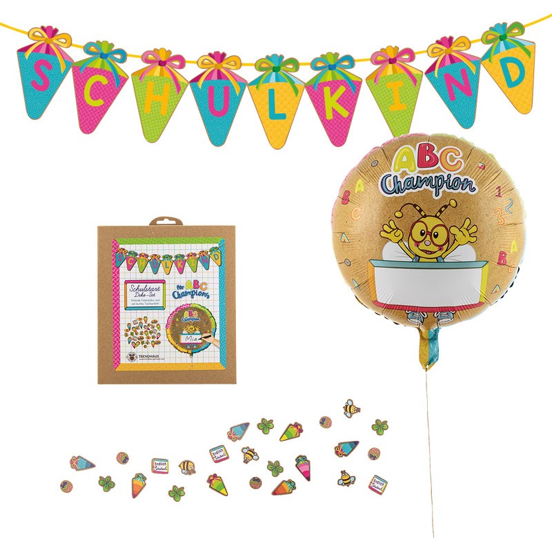 Set de décoration TRENDHAUS® Schulstart ABC Champions pour fêter la rentrée. Set composé d'une guirlande, texte en allemand, d'écolier, longueur 1,20 m, ruban jaune à suspendre, ballon en film plastique à marquer et personnaliser Ø 45 cm, convient pour l'hélium et l'air, dispositif de gonflage et confettis de table 20 g. Dimensions: L 210 x H 240 x P 25 mm.