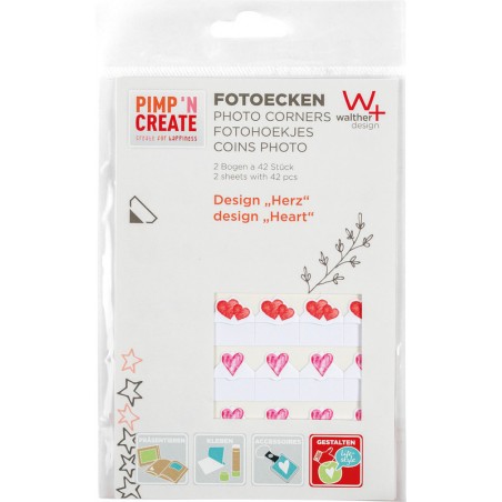Coins photos WALTHER motif Pimp 'N Create autocollants, sans solvant, résiste au temps, 4 motifs assortis, format 18 x 20 mm. Blister de 2 feuilles avec 42 coins photo chacune. Durabilité eco:plus: recyclable, emballage respectueux de l'environnement.