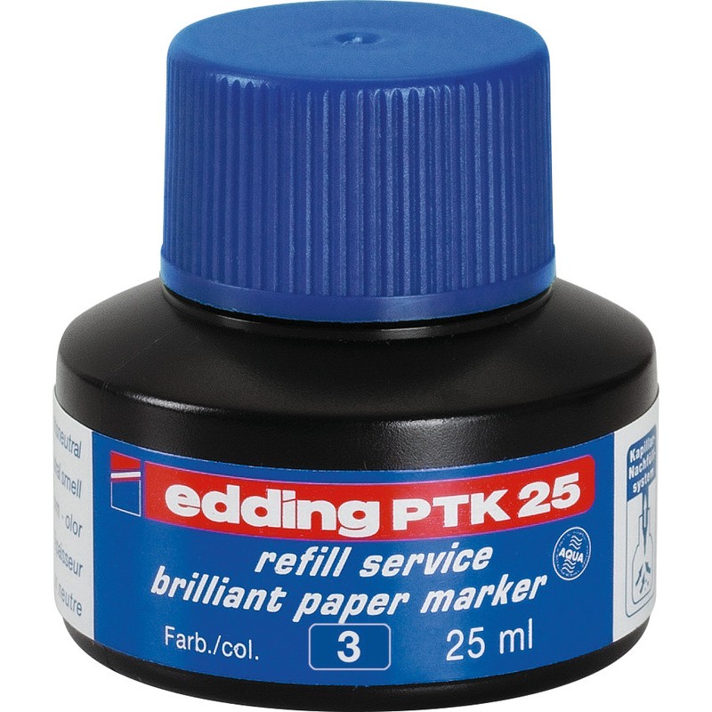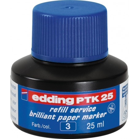 Encre de recharge EDDING® PTK 25 encre pigmentée permanente, à faible odeur, système capillaire, pour recharger les marqueurs EDDING® 30 et 33. Bouteille de 25 ml. Durabilité eco:plus: recyclable.