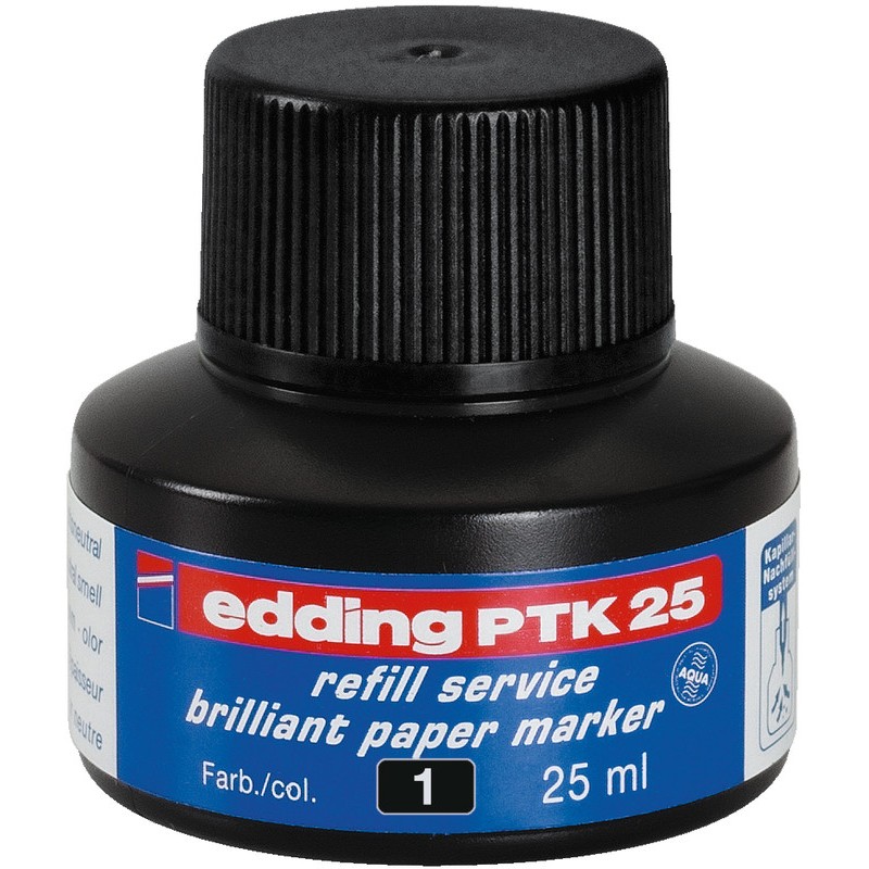 Encre de recharge EDDING® PTK 25 encre pigmentée permanente, à faible odeur, système capillaire, pour recharger les marqueurs EDDING® 30 et 33. Bouteille de 25 ml. Durabilité eco:plus: recyclable.