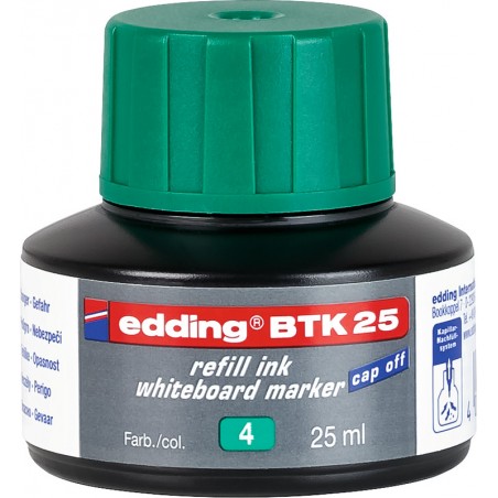 Recharge d'encre Board Marker EDDING® BTK 25 encre pigmentée avec système capillaire pour tableaux blancs EDDING® 28, 29, 250, 360, 361 et 363, peut rester ouvert pendant 6 semaines sans sécher grâce à l'encre cap-off. Flacon de 25 ml. Durabilité eco:plus: recyclable.