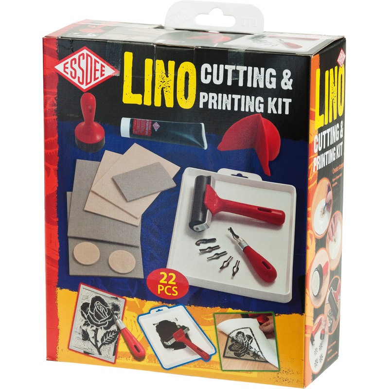 Set de linogravure ESSDEE set polyvalent pour sculpter ses propres tampons. Set de 6 gouges pour linogravure, pressoir manuel, rouleau à encrer, plateau à encrer format 240 x 200 mm, 2 plaques de linogravure format 178 x 127 mm, 2 plaques de linogravure SoftCut format 150 x 100 mm, plaque de linogravure pour tester, 2 tampons d'impression Ø 45 mm, outillage de linogravure pour gouges, protection pour la main et mode d'emploi.