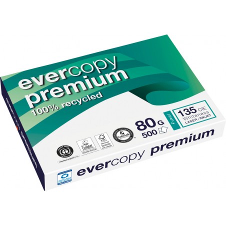Papier universel CLAIREFONTAINE Evercopy Premium recyclé, blanc fabriqué à 100% à partir de papier usagé, excellentes propriétés de passage en machine et bonne opacité, sans chlore. Degré de blancheur: 135 CIE. Pour copieurs, imprimantes laser, jet d'encre, laser couleur et copieurs couleur. Emballage de 500 feuilles. Certification: FSC, The Blue Angel et EU Ecolabel. emballage