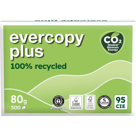 Papier universel CLAIREFONTAINE Evercopy Plus recyclé, blanc fabriqué à 100% à partir de papier usagé, excellentes propriétés de passage en machine et bonne opacité, sans chlore. Degré de blancheur: 95 CIE. Pour copieurs, imprimantes laser, jet d'encre, laser couleur et copieurs couleur. Emballage de 500 feuilles. Certification: FSC, The Blue Angel et EU Ecolabel.
