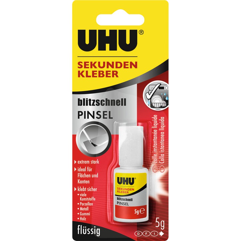 Colle instantanée liquide ultrarapide UHU® à pinceau liquide, colle presque tous les types de matériaux souples et rigides tels que le bois, la porcelaine, le métal, la céramique, le cuir, le caoutchouc, le liège, les textiles, le plastique, etc., idéale pour coller surfaces et bords, avec pinceau applicateur, flacon stable avec système antigoutte.