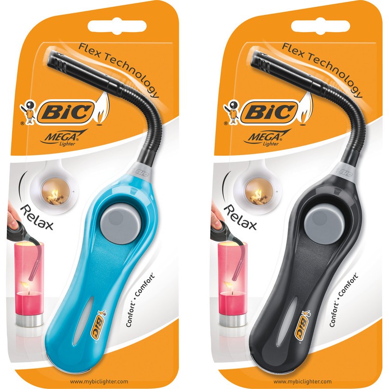 Multi-Briquet BIC® Megalighter Flex Relax avec tube long et flexible, forme étudiée pour une excellente prise en main, allumage facile et confortable grâce (110 mm) au boutton poussoir, niveau de gaz visible, non rechargeable, couleurs assorties, turquoise et noir.