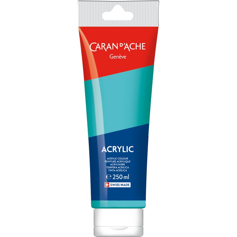 CARAN D'ACHE Acrylic couleurs acryliques lumineuses, ne craquellent pas, ne changent et ne se matifient pas après séchage, résistantes à la lumière, miscibles à l'eau, forte concentration pigmentaire, pour les surfaces lisses et texturées telles que la toile, tissus, papier, carton, verre, plastique, métal, bois, etc., s'appliquent au pinceau ou à la spatule. Tube de 250 ml.