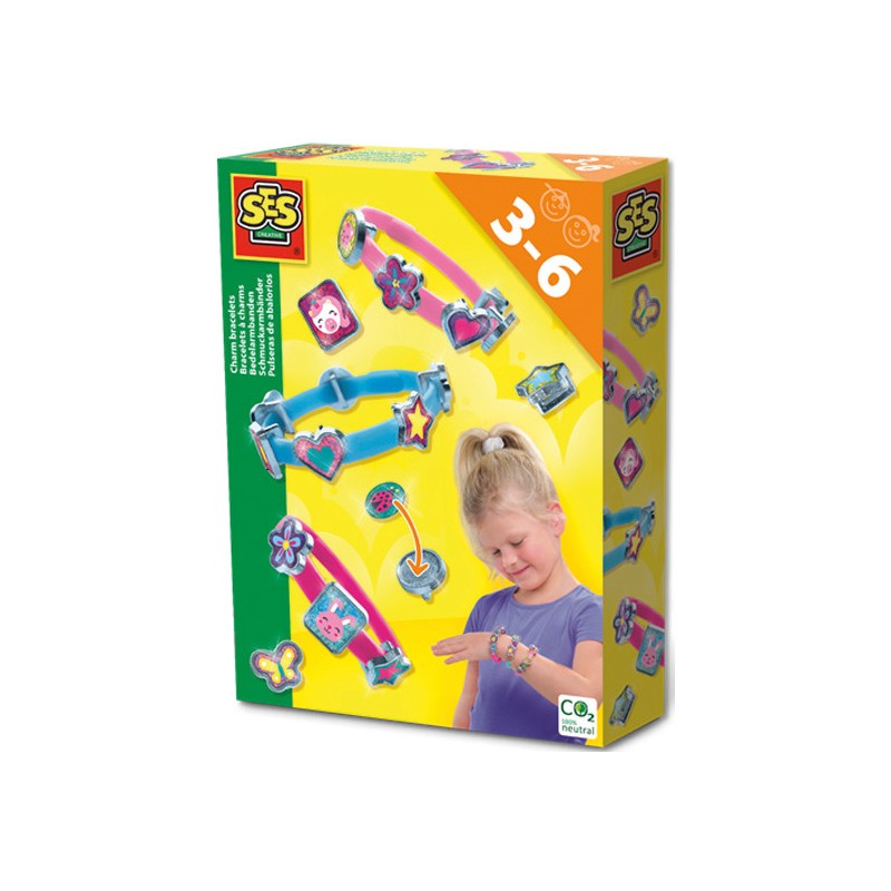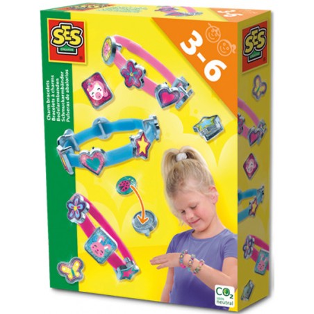 Set de bricolage SES® bracelets Charm dès 3 - 6 ans, créer ses propres bracelets sans fil, stimule les capacités motrices et la créativité. Set composé de 3 bracelets en plastique rose vif, rose et bleu, 18 pendentifs décoratifs et colle à paillettes.