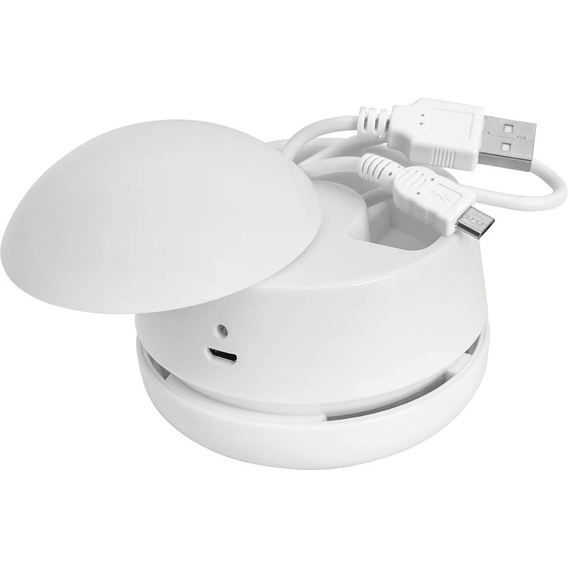Mini-aspirateur de table WEDO® W2D2 en ABS, idéal pour nettoyer claviers, tables à manger, rembourrages, etc. petit et maniable, grande puissance d'aspiration, petites brosses sur la partie inférieure, collecteur de saletés dévissable, rechargeable, livré avec câble USB et mode d'emploi. Dimensions: H 77 mm, Ø 83 mm.
