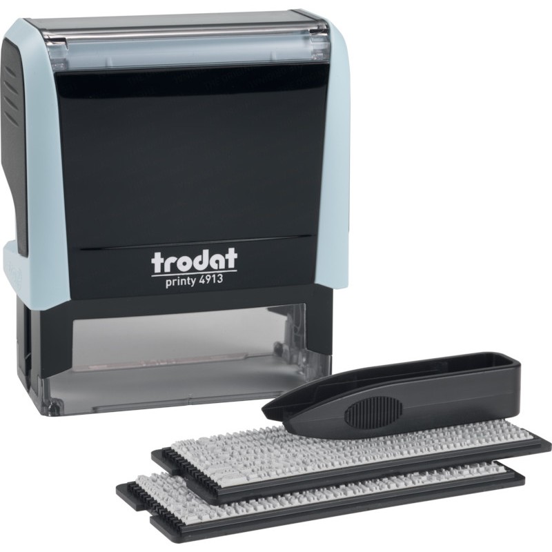 TRODAT® Typomatic 4.0 Printy(TM) Pastell Edition, timbre à encrage automatique à composer soi-même production CO2 compensé de série, avec coussin d'encrage TRODAT® interchangeable encré noir. 4913 typo, plaque 58 x 22 mm texte max. 5 lignes. 1 jeu de caractères en caoutchouc hauteur 3 mm (336 caractères) et 1 jeu de caractères hauteur 4 mm (288 caractères). Coussin 6/4913.