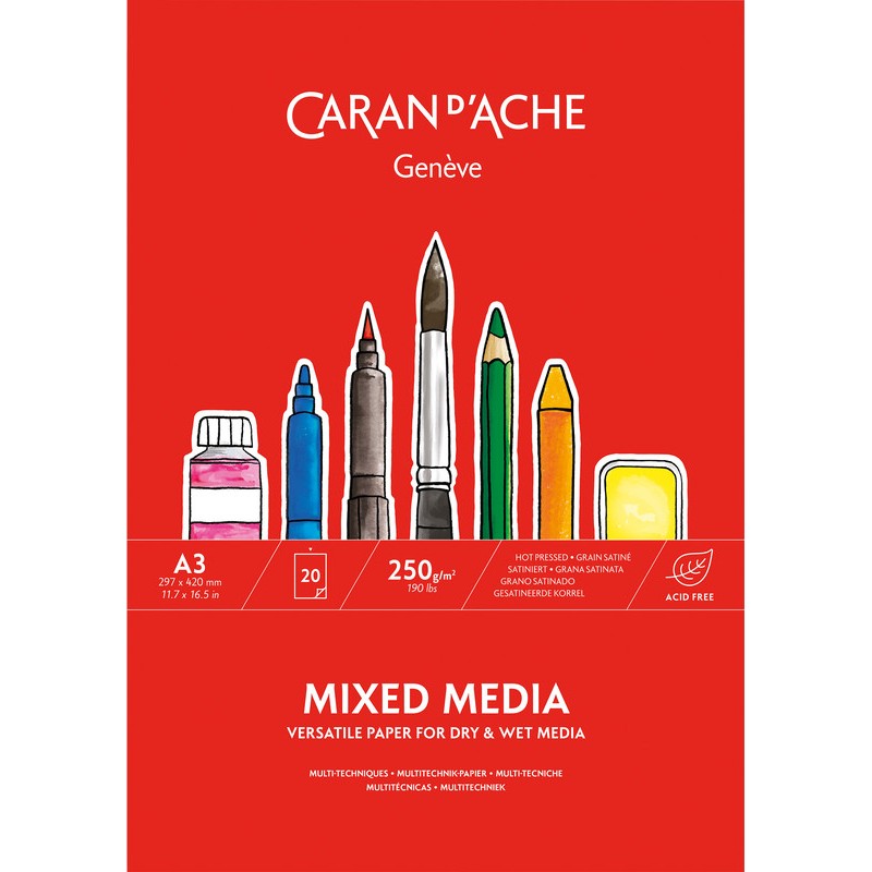 Bloc de papier à dessin CARAN D'ACHE Mixed Media 250 g/m2, papier à dessin blanc, satiné, sans acide, adapté aux crayons de couleur, acryl, gouache, aquarelle, etc., 20 feuilles. Durabilité eco:plus: Certification: FSC.