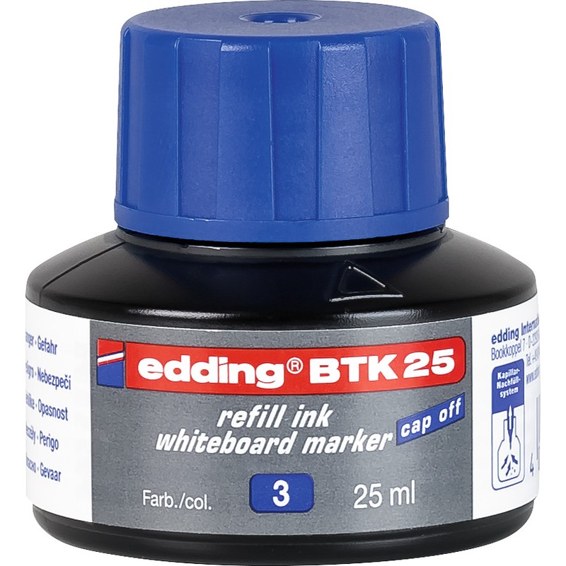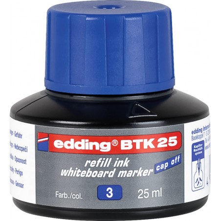 Recharge d'encre Board Marker EDDING® BTK 25 encre pigmentée avec système capillaire pour tableaux blancs EDDING® 28, 29, 250, 360, 361 et 363, peut rester ouvert pendant 6 semaines sans sécher grâce à l'encre cap-off. Flacon de 25 ml. Durabilité eco:plus: recyclable.