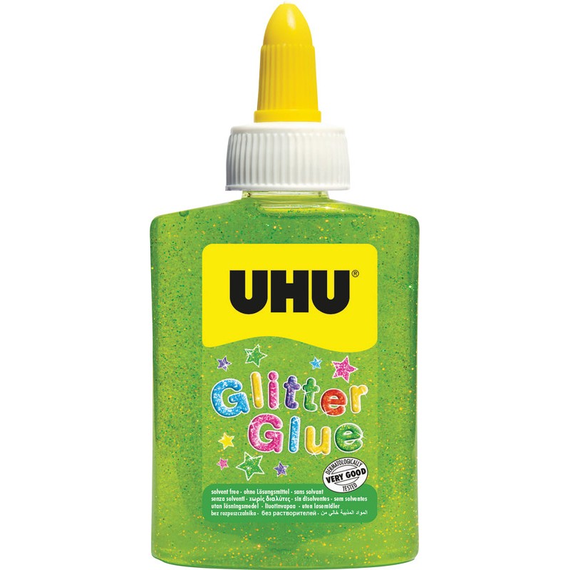 Glitter Glue UHU® avec des particules de paillettes pour des collages créatifs et décoratifs sur de nombreux supports comme le papier, le carton et le bois, flacon souple avec embout de précision, ne goutte pas et ne file pas, sèche au toucher en 30 min. et complètement sèche après environ 12 h, sans solvant, ne résiste pas au lavage, testé sous contrôle dermatologique. bouteille de 88,5 ml