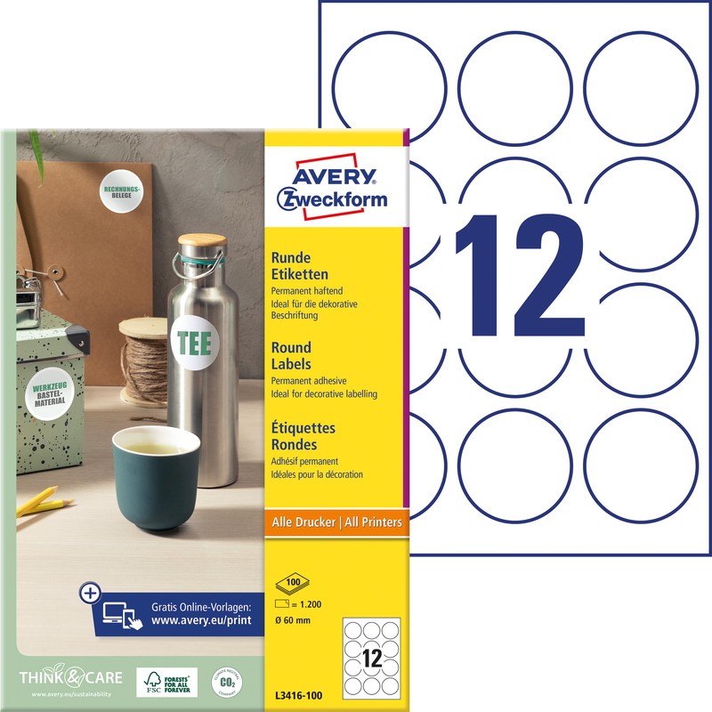 Etiquettes universelles AVERY® ZWECKFORM étiquettes adhésives blanches sur feuilles DIN A4, défilement sûr, excellente adhérence du toner, absorption rapide des couleurs. Pour copieurs, imprimantes laser, jet d'encre, laser couleur et copieurs couleur, inscription facile avec le concepteur d'étiquettes en ligne gratuit sur www.avery.eu/print. Durabilité eco:plus: Certification: FSC. emballage de 100 feuilles