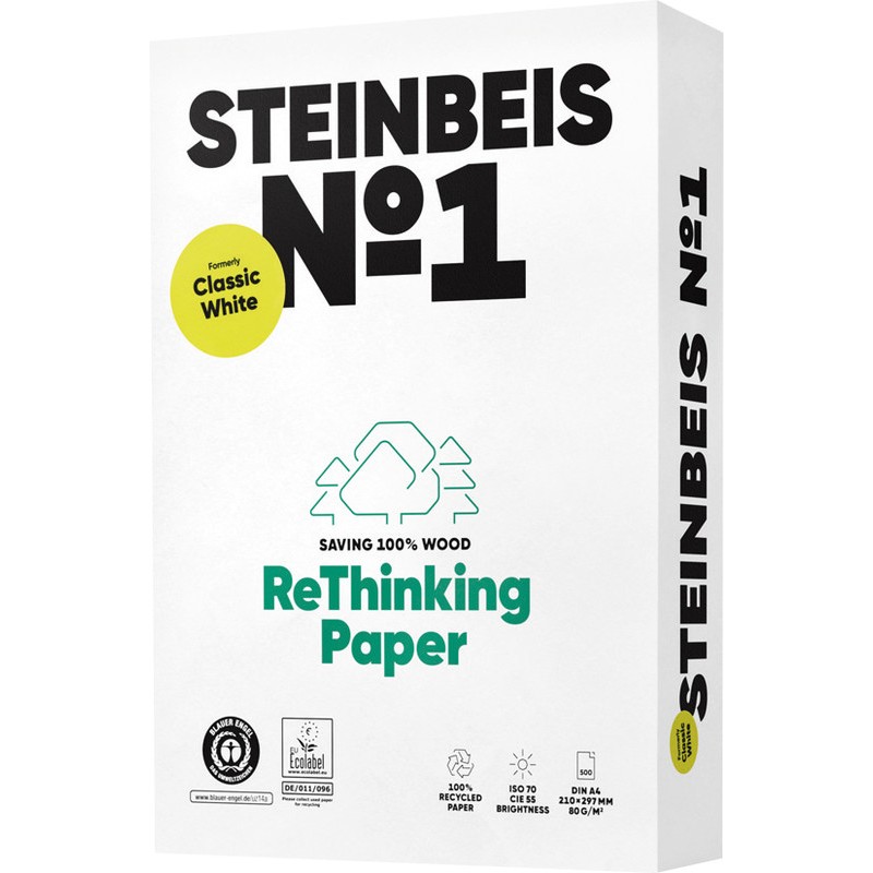 Papier universel STEINBEIS No 1 recyclé blanc recyclé ISO 70, mat, le papier recyclé haut de gamme 100% à partir de papier usagé. Degré de blancheur: 55 CIE. Pour copieurs, imprimantes laser, jet d'encre, laser couleur et copieurs couleur. Emballage de 500 feuilles. Durabilité eco:plus: compostable, dégradable, recyclable, teneur en déchets recyclés après utilisation max. 100%, emballage respectueux de l'environnement. Certification: FSC. emballage