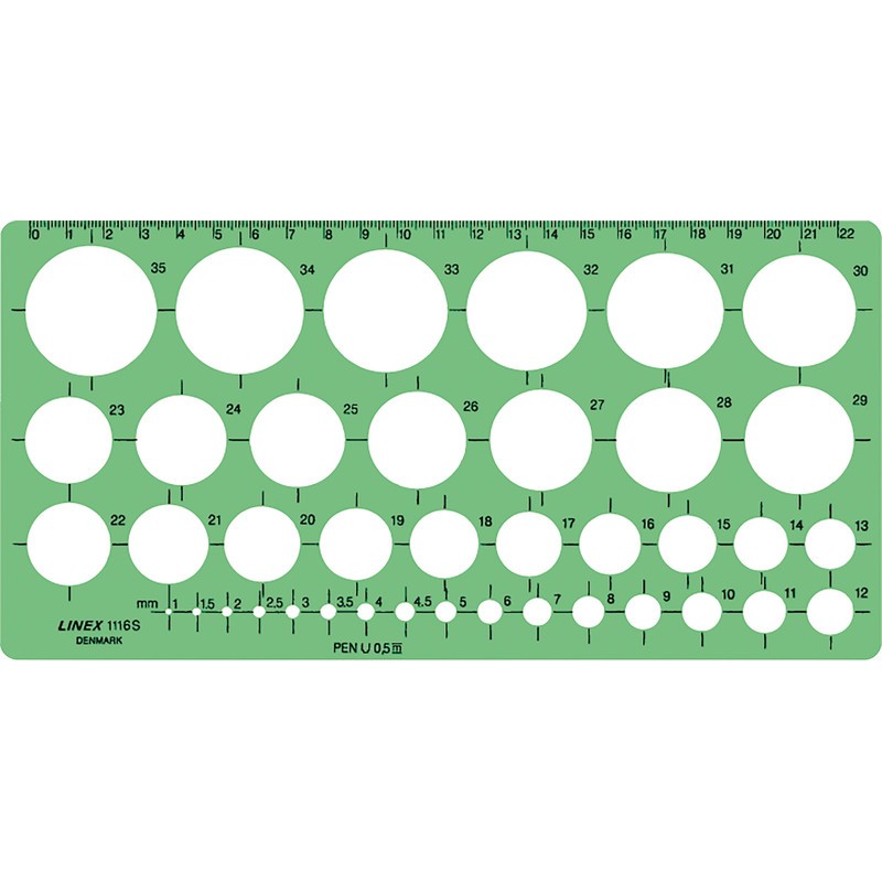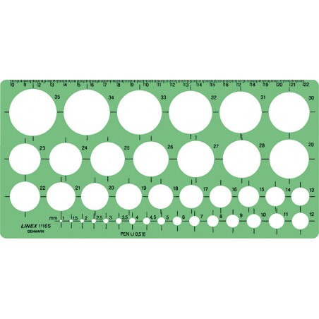 Gabarit de cercles LINEX® de Ø 1 - 35 mm en PP, cercles de Ø 1 à 35 mm avec progression de 1 mm par 1 mm, y compris 1,5/2,5/3,5 et 4,5 mm, avec tampons d'appui, avec graduation en millimètres.