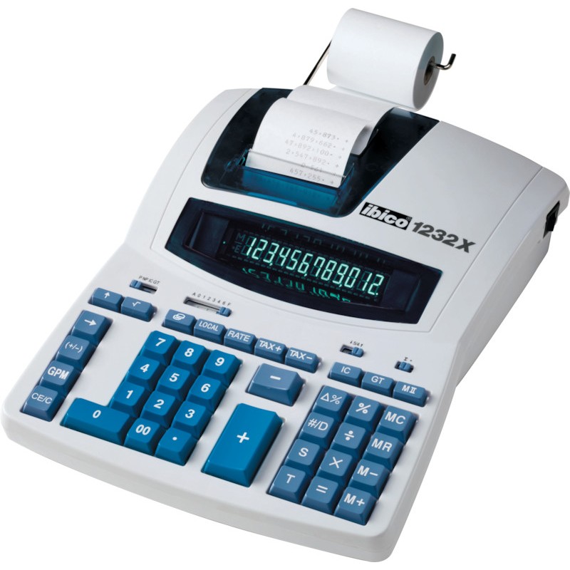 Calculatrice de bureau avec imprimante IBICO® 1232X avec affichage LCD de 12 chiffres, chiffres verts, impression bicolore noir/rouge, papier 57 mm, vitesse d'impression 4,1 lignes/sec., 4 touches mémoire, compteur de postes, conversion de devises, touches racine carrée, Tax +/-, % et Delta-%. Alimentation: adaptateur secteur (fourni). Dimensions: L 230 x H 75 x P 300 mm. Poids: 1,8 kg. Prix incluant la TAR.