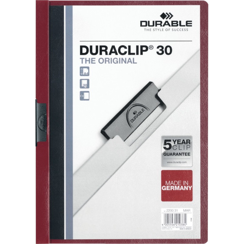 Dossier à pince DURABLE Duraclip® 30 pour documents non perforés, couverture en plastique rigide transparent, dos de couleur, pince en acier, capacité max. 30 feuilles 80 g/m2. Garantie: 5 ans sur la pince. Durabilité eco:plus: recyclable, composant recyclé, teneur en déchets recyclés avant utilisation max. 5%, teneur en déchets recyclés après utilisation max. 2%. pour format A4