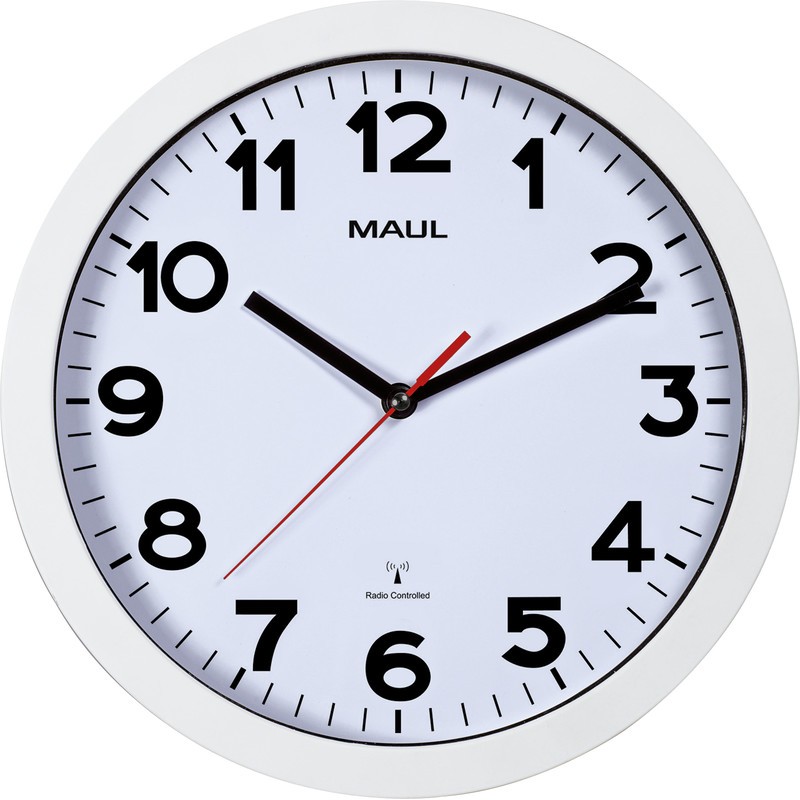 Horloge murale MAUL step boîtier en plastique incassable, verre de protection en verre minéral, trotteuse, alimentation par 1 pile AA (fournie). Dimensions: P 50 mm. Prix incluant la TAR. horloge radiocommandée synchronisation automatique par le signal DCF77, avec mise à l'heure automatique aux changements d'horaire (été/hiver).