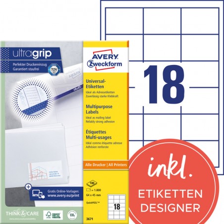Etiquettes universelles AVERY® ZWECKFORM ultragrip étiquettes adhésives blanches sur feuilles DIN A4, la technologie ultragrip garantit un alignement parfait et une impression sans bourrage, défilement sûr, excellente adhérence du toner, absorption rapide des couleurs. Pour copieurs, imprimantes laser, jet d'encre, laser couleur et copieurs couleur. Durabilité eco:plus: emballage respectueux de l'environnement. Certification: FSC, TÜV. emballage de 100 feuilles