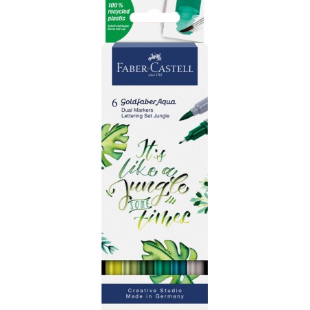 Dual Marker Lettering Set FABER-CASTELL Goldfaber Aqua feutre à 2 fonctions, avec une pointe fine 0,6 mm pour les contours et les détails et une pointe pinceau conçue pour les traits fins, larges et les surfaces pleines, encre à base d'eau, capuchon dans la couleur de l'encre, aquarellable, inodore, sans acide, PH neutre, non rechargeable, 6 couleurs assortis, dans étui en carton.