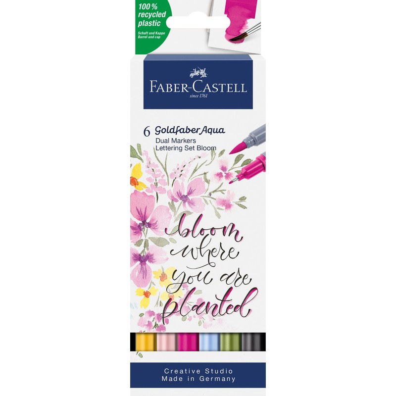Dual Marker Lettering Set FABER-CASTELL Goldfaber Aqua feutre à 2 fonctions, avec une pointe fine 0,6 mm pour les contours et les détails et une pointe pinceau conçue pour les traits fins, larges et les surfaces pleines, encre à base d'eau, capuchon dans la couleur de l'encre, aquarellable, inodore, sans acide, PH neutre, non rechargeable, 6 couleurs assortis, dans étui en carton.
