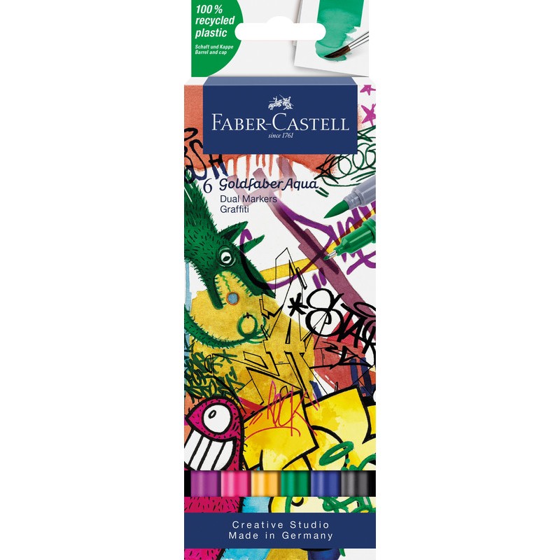 Dual Marker Lettering Set FABER-CASTELL Goldfaber Aqua feutre à 2 fonctions, avec une pointe fine 0,6 mm pour les contours et les détails et une pointe pinceau conçue pour les traits fins, larges et les surfaces pleines, encre à base d'eau, capuchon dans la couleur de l'encre, aquarellable, inodore, sans acide, PH neutre, non rechargeable, 6 couleurs assortis, dans étui en carton.