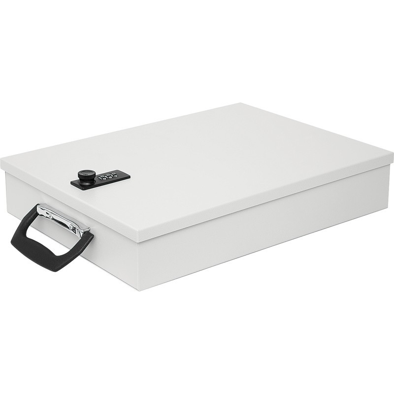 Caissette à documents WEDO® en tôle d'acier thermolaquée, surface mate et résistante, poignée de transport, pour la conservation des documents importants et contrats, serrure à combinaison 3 chiffres réglable individuellement, 2 trous dans le fond permettant une fixation par vis dans un tiroir. Dimensions: L 260 x H 355 x P 67 mm. Poids: 2,2 kg.