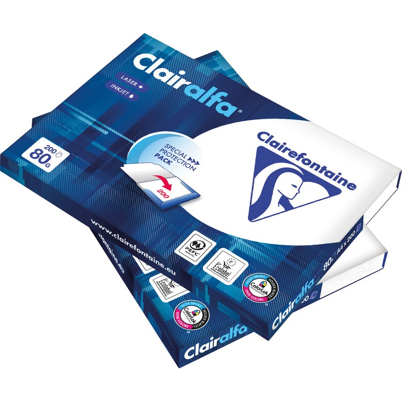 Papier universel CLAIREFONTAINE Clairalfa Premium, extra-blanc répond aux plus hautes exigences, sans chlore élémentaire. Degré de blancheur: 171 CIE. Pour copieurs, imprimantes laser, jet d'encre, laser couleur et copieurs couleur. Durabilité eco:plus: dégradable, recyclable. Certification: FSC, EU Ecolabel. emballage de 200 feuilles avec emballage refermable.