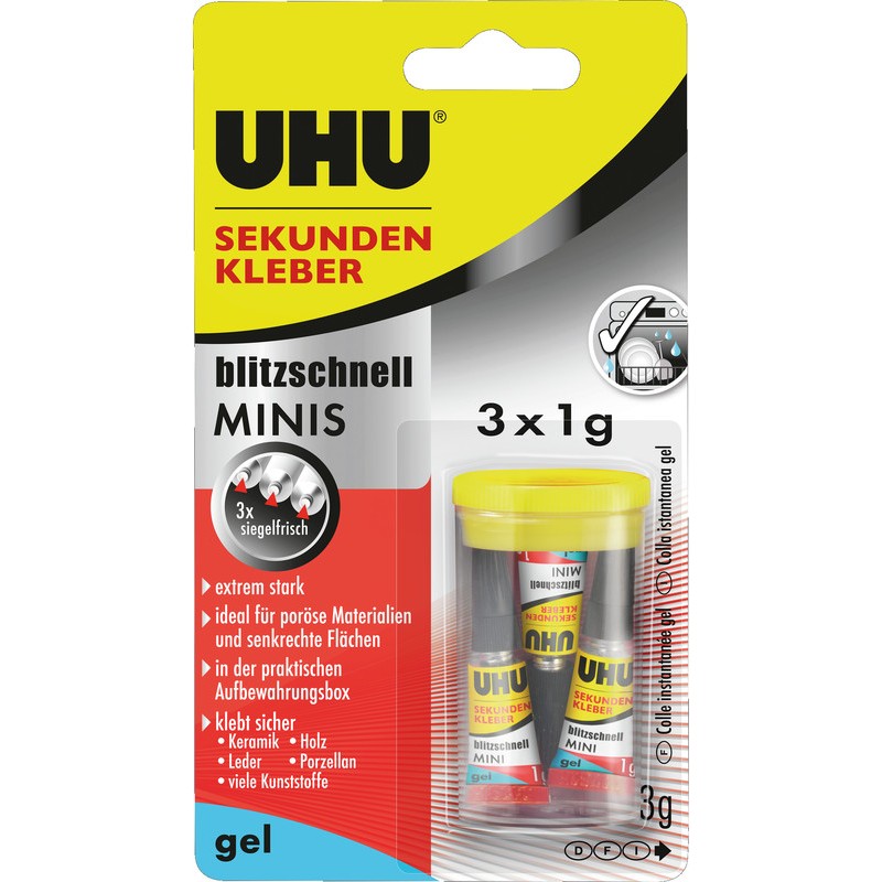 Colle instanée superrapide UHU® Minis Gel extraforte, ne goutte pas, colle presque tous types de matériaux souples, rigides et poreux tels que le bois, la porcelaine, le métal, la céramique, le cuir, le plastique, etc., idéale pour les surfaces verticales, dans boîte de conservation pratique.