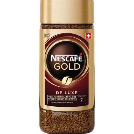 Café NESCAFÉ® Gold de Luxe café soluble, moulu, arôme riche et goût équilibré, avec de l'arabica torréfié doré, intensité 7. Emballage de 100 g.