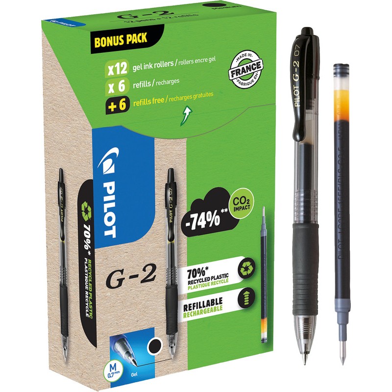 Roller à encre gel PILOT G-2 Bonus Pack pointe en métal, grip caoutchouc antidérapant et clip dans la couleur de l'encre, rétractable, rechargeable, largeur de la bille 0,7 mm, largeur de trait 0,37 mm. Emballage de 12 x roller et 6 x refill + 6 free. Durabilité eco:plus: durée de vie du produit prolongée, composant recyclé, teneur en déchets recyclés avant utilisation max. 70%, teneur en déchets recyclés après utilisation max. 70%, emballage respectueux de l'environnement.