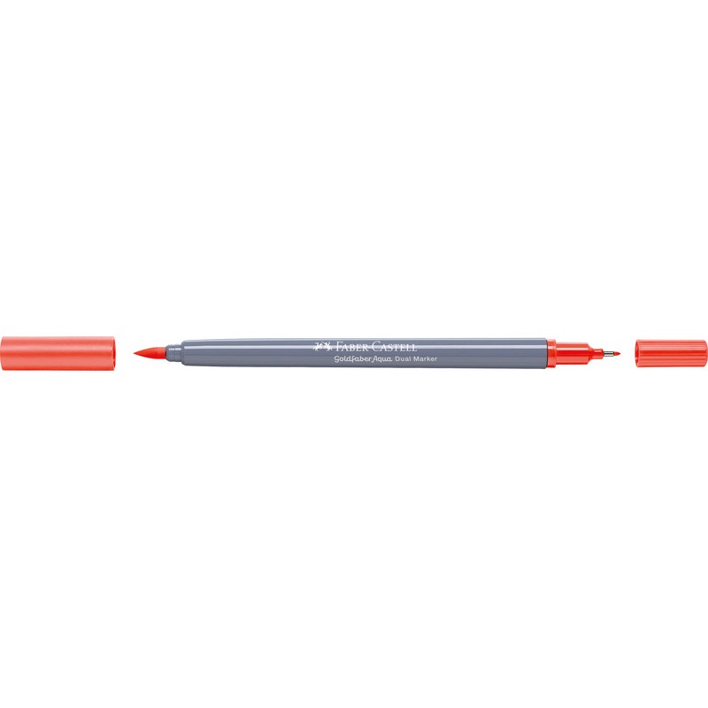 Dual Marker FABER-CASTELL Goldfaber Aqua feutre à 2 fonctions, avec une pointe fine 0,6 mm pour les contours et les détails et une pointe pinceau conçue pour les traits fins, larges et les surfaces pleines, encre à base d'eau, capuchon dans la couleur de l'encre, aquarellable, inodore, sans acide, PH neutre, non rechargeable. Durabilité eco:plus: durée de vie du produit prolongée, energie récupérée, composant recyclé, teneur en déchets recyclés avant utilisation max. 51%, réduction des déchets.