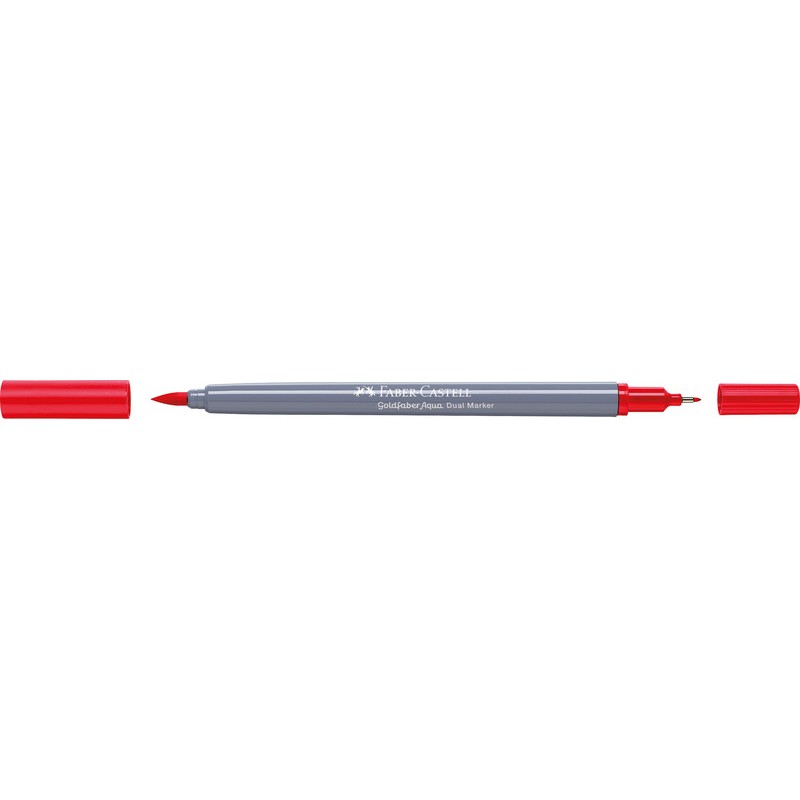 Dual Marker FABER-CASTELL Goldfaber Aqua feutre à 2 fonctions, avec une pointe fine 0,6 mm pour les contours et les détails et une pointe pinceau conçue pour les traits fins, larges et les surfaces pleines, encre à base d'eau, capuchon dans la couleur de l'encre, aquarellable, inodore, sans acide, PH neutre, non rechargeable. Durabilité eco:plus: durée de vie du produit prolongée, energie récupérée, composant recyclé, teneur en déchets recyclés avant utilisation max. 51%, réduction des déchets.