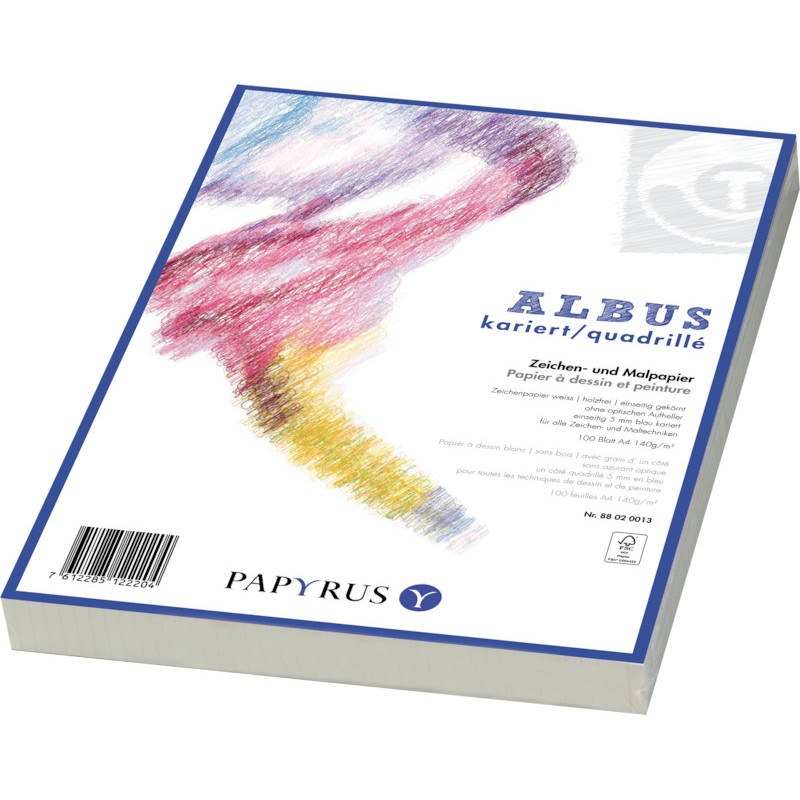 Papier à dessin et peinture PAPYRUS Albus Paperart, quadrillé papier blanc, 160 g/m2, un côté grainé, un côté quadrillé 5 mm bleu, sans chlore, acide et bois, sans azurant optique. Durabilité eco:plus: compostable, dégradable, recyclable, emballage respectueux de l'environnement.