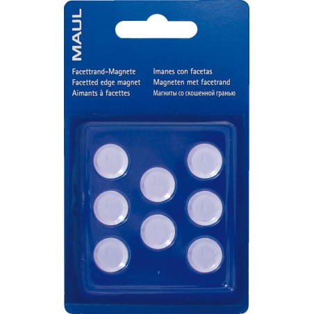 Aimants avec bordure à facettes MAUL pro sur carte blister corps en Luran incassable, surface légèrement érodée, bordure à facettes polie fin, le noyau d'aimant est fixé fermement par une colle spéciale, dessous laqué assurant une bonne protection des surfaces aimantées. aimants ronds, Ø 15 mm, H 7 mm, force d'adhérence 170 g, blister de 8 pièces