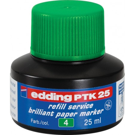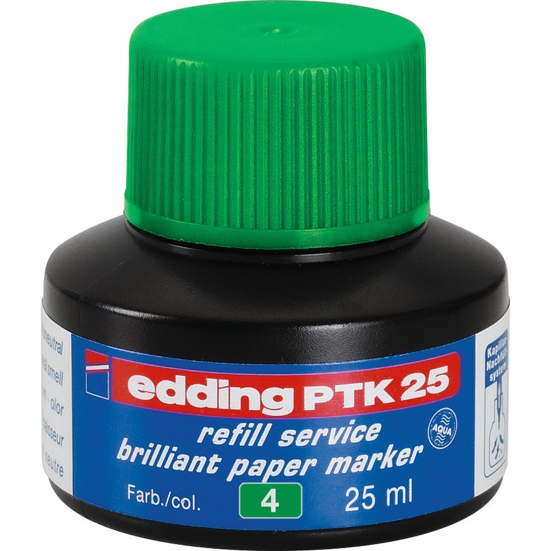 Encre de recharge EDDING® PTK 25 encre pigmentée permanente, à faible odeur, système capillaire, pour recharger les marqueurs EDDING® 30 et 33. Bouteille de 25 ml. Durabilité eco:plus: recyclable.