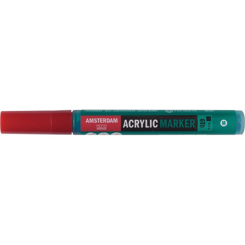 Marqueur acrylique AMSTERDAM pointe ogive, couleur brillante à base d'eau, très grande résistance à la lumière, parfait pour esquisser, peindre ou écrire sur un grand nombre de supports acryliques, p. ex. sur les châssis entoilés, le bois ou la terre cuite, séchage rapide, résistant à l'eau après séchage, non rechargeable, largeur de trait env. 4 mm.