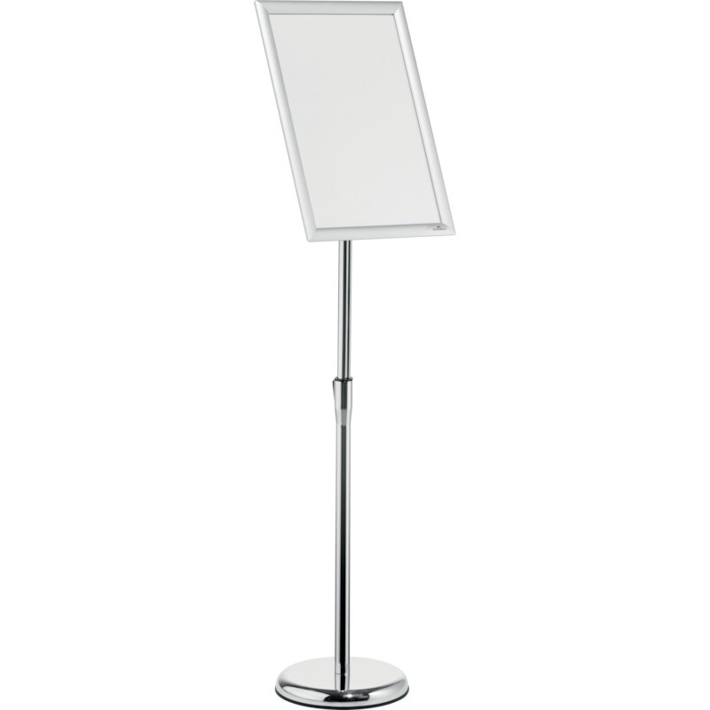 Cadre d'affichage DURABLE cadre en aluminium, mise en place et remplacement rapides des affiches grâce au cadre clipsable, stabilité peut être assurée en remplissant le socle avec du sable, socle, rond est équipé de patins en caoutchouc pour éviter les rayures au sol, présentation verticale ou horizontale, angle de lecture réglable de 5° à 90°, convient aux zones d'accueil, aux foires, aux halls de réception et aux salles d'attente. Livré avec kit de montage et instructions.