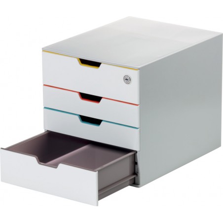 Module à tiroirs DURABLE Varicolor® Safe en ABS de qualité supérieure, un tiroir se ferme à clé, livré avec 2 clés, superposable, tiroirs à coulissement silencieux et avec butées d'arrêt, porte-étiquettes transparents, patins antidérapants, pour format A4/C4, folio et letter size. Garantie: 5 ans. Durabilité eco:plus: recyclable. 4 tiroirs fermés en couleur tiroirs supérieur et inférieur au format XXL. Dimensions extérieures: L 280 x H 292 x P 356 mm.