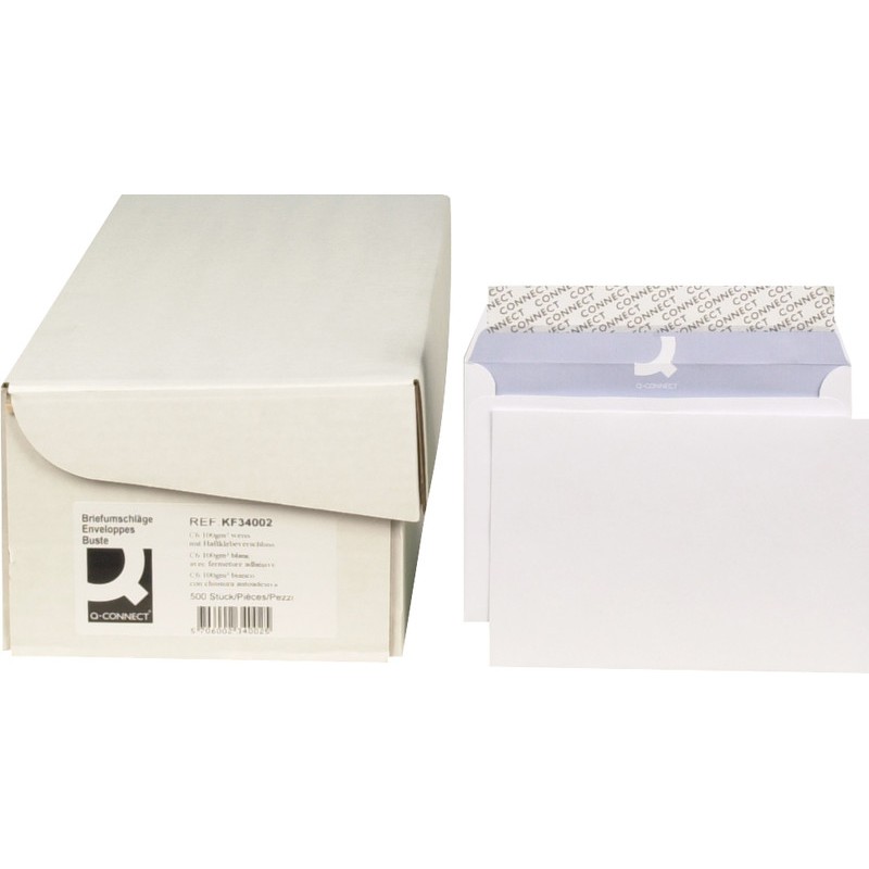 Enveloppes Q-CONNECT®, emballage de bureau blanches, sans chlore élémentaire, intérieur gris, couleur 100% à base d'eau. C6, avec fermeture autoadhésive 162 x 114 mm, façon DNG-HK. Boîte de 500 pièces.