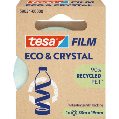 Ruban adhésif TESA® Film eco & crystal ecoLogo® film support 90% en PCR PET recyclé, bague 100% en plastique recyclé, qualité transparente, pratiquement invisible sur la plupart des surfaces, fort pouvoir adhésif, déroulement régulier et silencieux, résistance élevée au vieillissement, sans solvant. Durabilité eco:plus: dégradable, recyclable, composant recyclé, teneur en déchets recyclés avant utilisation max. 10%, teneur en déchets recyclés après utilisation max. 10%, réduction des déchets.