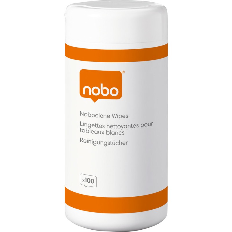 Chiffons de nettoyage NOBO® pour tableaux blancs Noboclene(TM) chiffons en ouate de cellulose non pelucheuse, imbibés d'une lotion de nettoyage pour tableaux blancs et plannings muraux, conviennent également pour les boîtiers d'ordinateur et les claviers. Boîte distributrice de 100 pièces.