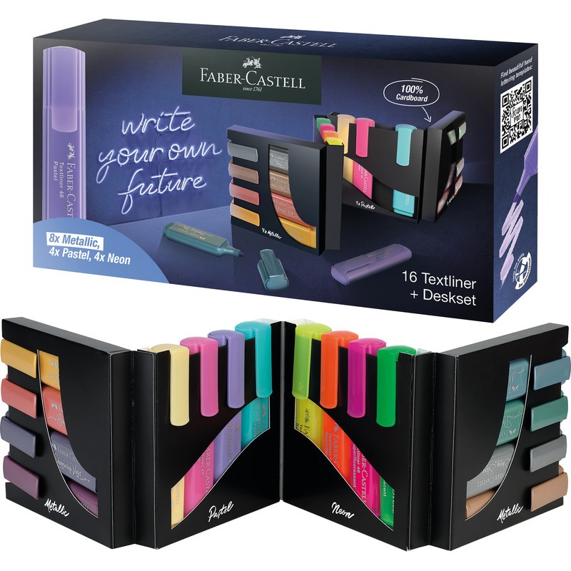 Surligneur FABER-CASTELL 46 Desktop Set pointe biseautée, clip, encre à base d'eau, résistante à la lumière, rechargeable, largeur de trait 1 - 5 mm. Etui en carton de 16 couleurs, 4 néon, 4 pastel et 8 métallisé. Durabilité eco:plus: emballage respectueux de l'environnement.