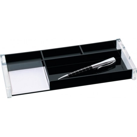 Plumier pour stylo WEDO® Acrylique en acrylique clair combiné avec un noir profond, casier pour les stylos, trois compartiments de rangement, compartiment pour bloc de notes adhésives (76 x 76 mm), avec 4 patins antidérapants. Dimensions: L 270 x H 30 x P 125 mm.