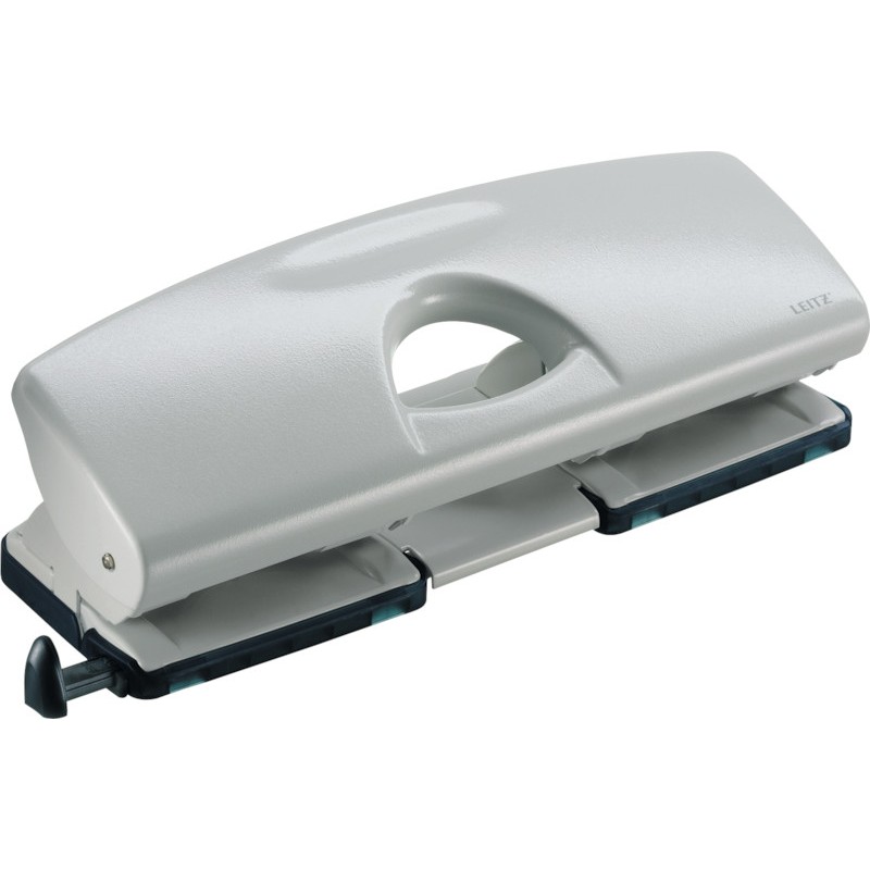 Perforateur double LEITZ® 5022 partie supérieure en fonte d'aluminium, socle en métal, pour écartement 8 cm, perforation Ø 5,5 mm, 2 mécanismes pour écartement 8 x 8 x 8 cm, avec réglette, capacité de perforation env. 1,6 mm (16 feuilles). Garantie: 10 ans. Certification: GS.