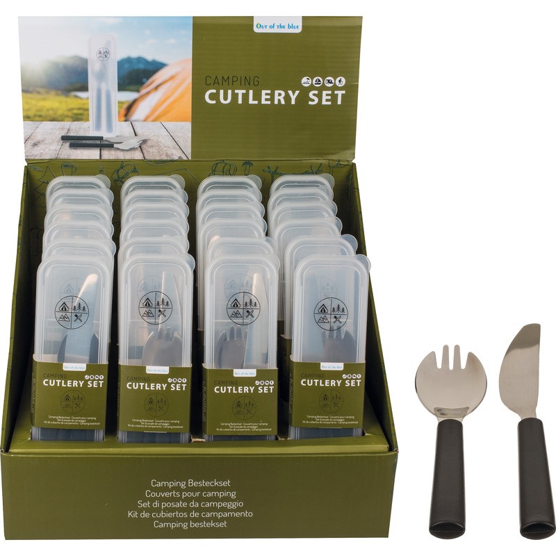 Set de couverts de camping OUT OF THE BLUE en acier inoxydable, poignée en PP, résistante au lave-vaisselle, dans emballage hygiénique. Set composé de couteau, fourchette et cuillère. Dimensions: couteau 19 cm, fourchette/cuillère 14,5 cm.