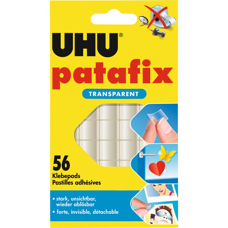 Pastilles adhésives UHU® patafix transparent pastilles adhésives détachables pour une fixation rapide et propre, idéales pour les surfaces en verre ou transparentes, format 12 x 12 mm. Emballage de 56 pastilles adhésives.