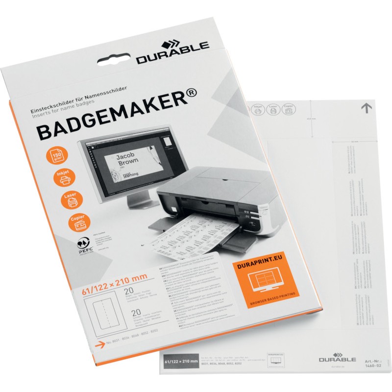 Etiquettes pour badges DURABLE Badgemaker® 150g/m2, blanches, avec microperforation, format A4, inscription facile avec le logiciel d'étiquetage gratuit Duraprint® sur www.duraprint.fr. Pour copieurs, imprimantes laser, jet d'encre, laser couleur et copieurs couleur. Boîte de 20 feuilles. Durabilité eco:plus: recyclable. format des étiquettes 210 x 61 mm pour badges 8031, 8034, 8048, 8052, 8202, 8271.
